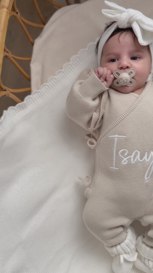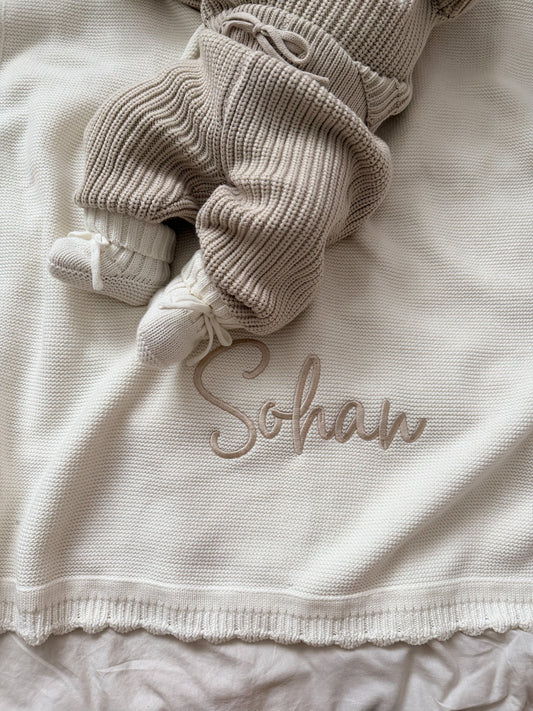 Découvrez nos plaids en maille brodé, personnalisable avec le prénom de votre choix. Doux, chaleureux, il est parfait pour envelopper bébé de confort.