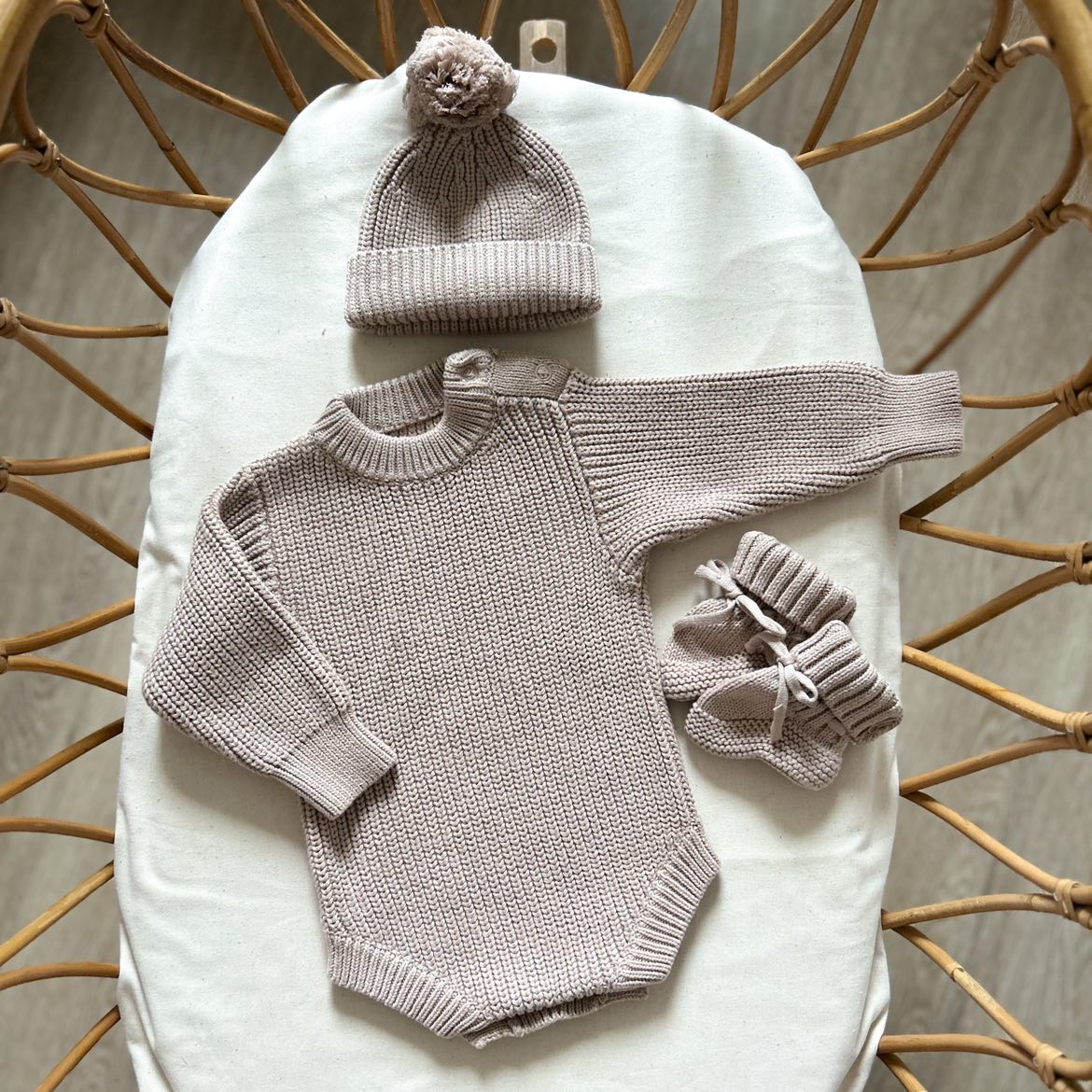 Offrez à votre bébé douceur et élégance avec notre ensemble 3 pièces composé d'une barboteuse, un bonnet des chaussons en maille de coton.