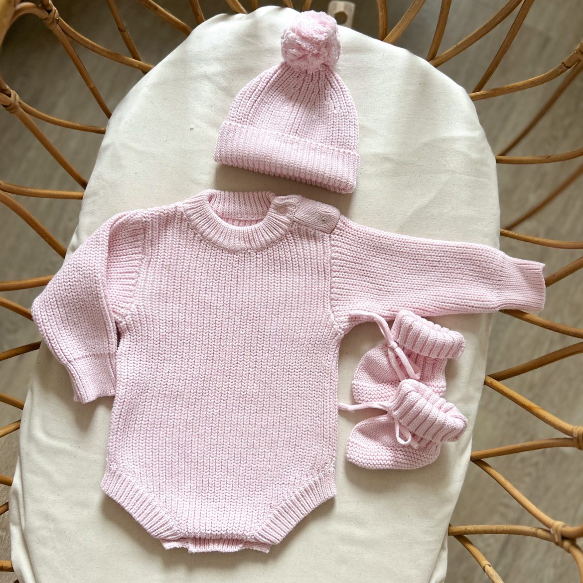 Offrez à votre bébé douceur et élégance avec notre ensemble 3 pièces composé d'une barboteuse, un bonnet des chaussons en maille de coton.
