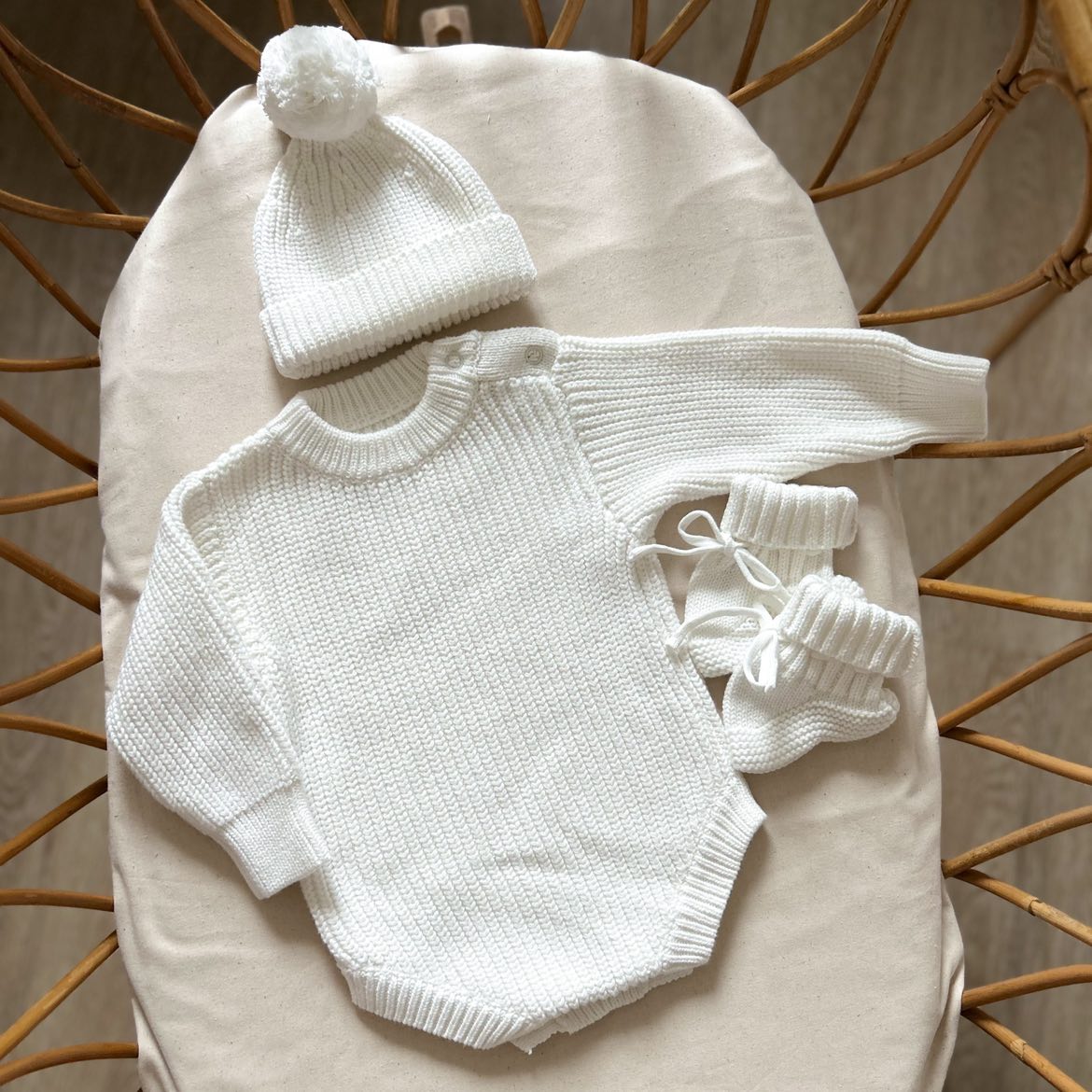Offrez à votre bébé douceur et élégance avec notre ensemble 3 pièces composé d'une barboteuse, un bonnet des chaussons en maille de coton.